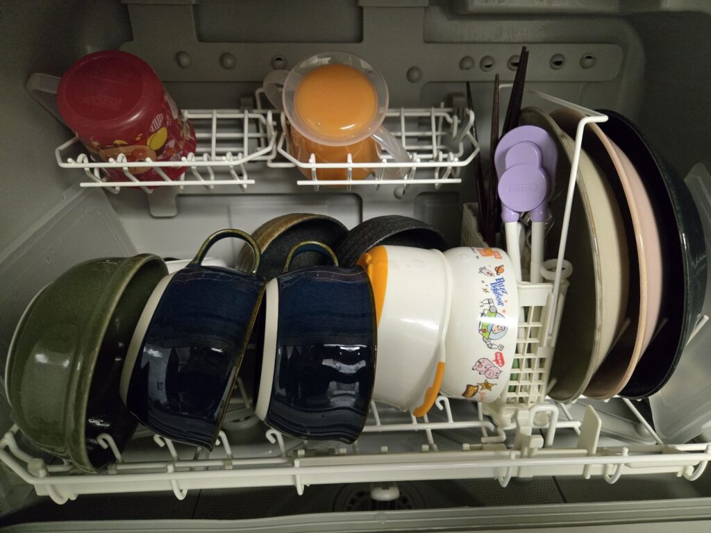 我が家は3歳と1歳の子供がいる4人家族で、朝昼晩でそれぞれ食洗機が稼働しているので問題ありませんが、1日の食器をまとめて1回で洗うほど容量はないので、注意が必要です。